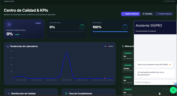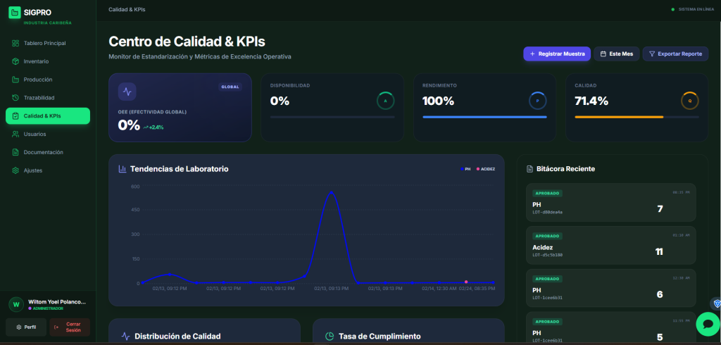 - Centro de Calidad: Registro de bitácoras de laboratorio y dashboards de métricas de eficiencia (OEE) globales.